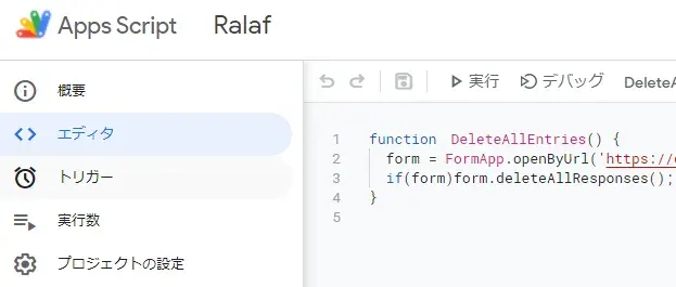 関数名を変更した後、 FormApp.openByUrl を利用して自動削除対象のGoogle Formを登録します。