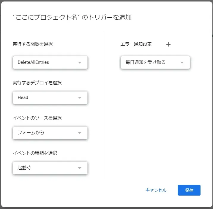 「実行する関数を選択」に先ほど作成した関数をセットし、「イベントの種類を選択」に「開始時」をセットします。