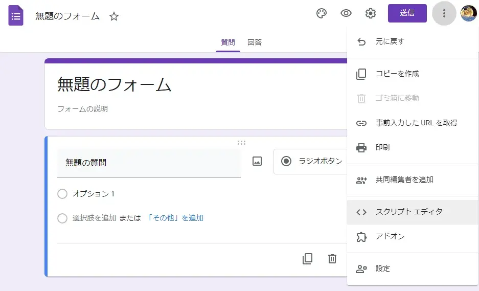 自動で回答を削除したいGoogle Formの編集画面より、「スクリプトエディタ」を選択してGoogle Apps Scriptを開きます。